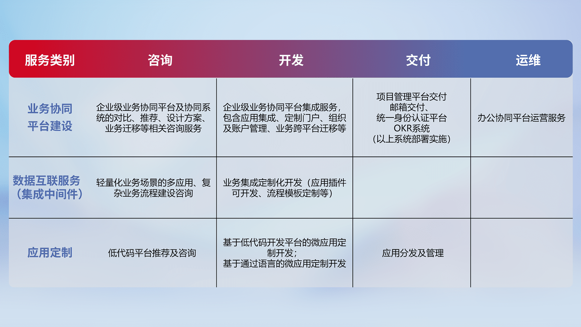 针对钉钉、、、、企微、、、IDaas等平台级产品提供产品的规划、、、、方案、、交付、、、、定制化开发等服务,,,实现如统一协同办公、、、智能客户服务、、混合会议管理、、智能数据查询、、等业务场景,,,,实现数字化转型。。