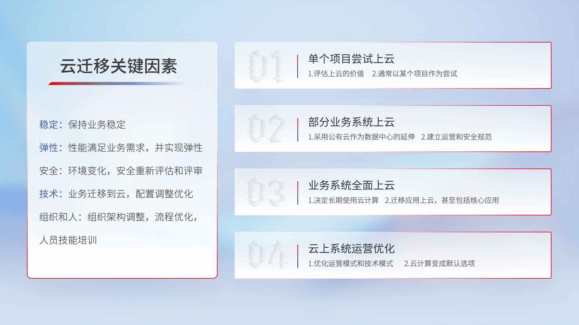 结合实际业务,,从规划设计、、、云平台选型、、、、云原生改造、、数据迁移、、、、集成交付,,迁移全过程为客户识别最佳上云路径,,,做好风险识别管理,,,,设计网络架构、、、、身份权限、、、、安全审计合规、、、、操作审计、、、日志审计、、、、监控告警策略、、、多站点容灾设计等,,,对云上基础设施进行整体规划,,,,提升IT治理水平,,以满足弹性、、高可用、、高性能的需求。。。