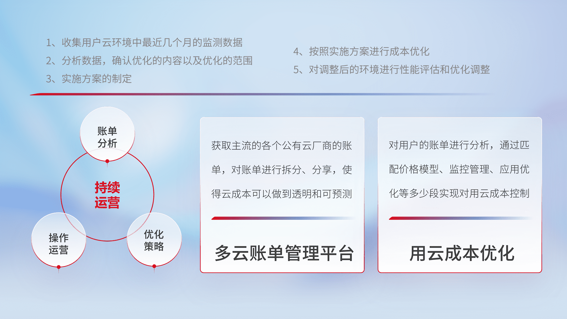 通过多云纳管,,以统一的资源数据模型把客户的云资源进行抽象和封装,,进而实现对多云资源的统一操作,,保障云资源管理的可靠性、、、稳定性与可用性。。。。量身定制化运维内容,,,,配置、、、、开发运维、、、补丁管理、、、备份、、监控、、、认证和访问管理、、审计和日常巡检等,,,保障在用云过程中的可靠度,,,稳定度以及高可用率。。。